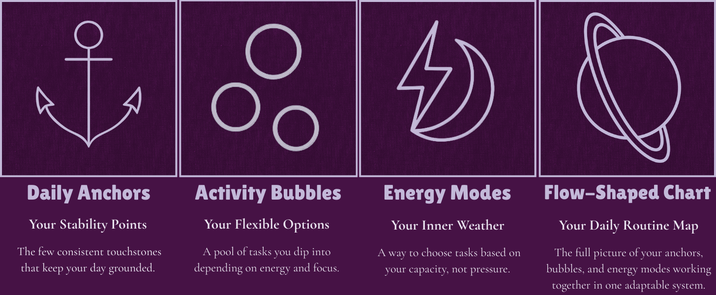 It’s a planning framework for people who need flexible structure, not discipline, not rigid schedules, and not constant output.